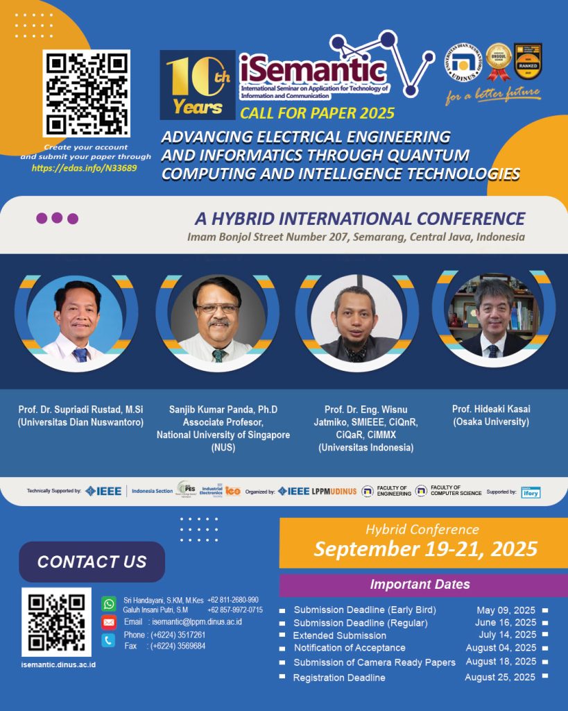 iSemantic is an international conference organized by Universitas Dian Nuswantoro Semarang. iSemantic is an acronym for International Seminar on Application for Technology of Information and Communication. iSemantic 2025 is the 10th international conference held by Universitas Dian Nuswantoro. iSemantic 2025 conference will be held hybrid on 19-21 September 2025 in Semarang, Indonesia.